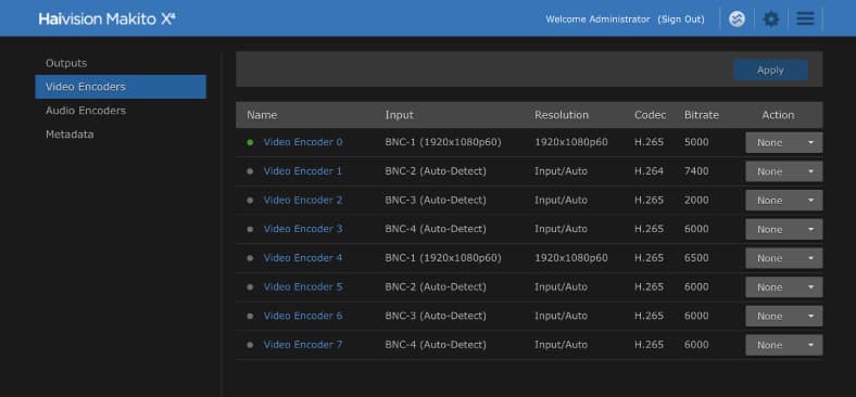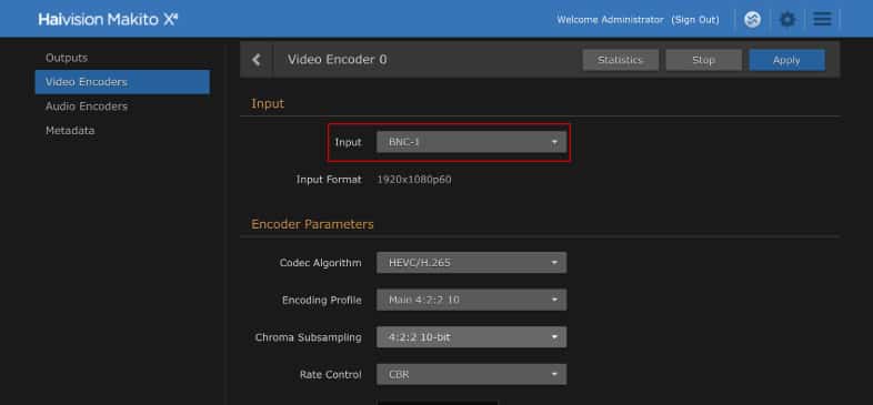 To view details or modify the video settings for an encoder, click on the video encoder in the table to open the video encoders detail view. From here you will be able to select the specific video input, resolution, codec and bitrate for each core. Each video encoding core can be configured to 1 of the 4 video inputs (BNC-1, 2, 3 and 4). In this example, for Video Encoder 0, we’ll set the input to BNC-1 which is the only 12G-SDI capable port, all the other ports are 3G-SDI capable.
