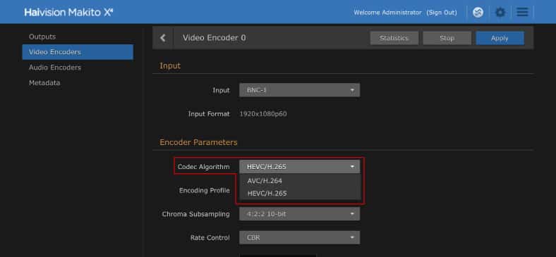 Next, it’s time to select your video encoding parameters. Underneath the input option in the video encoders detail view there are a variety of encoder parameters available. These include the codec algorithm, the encoding profile, the type of chroma subsampling and pixel depth, bitrate, frame rate and so on. First, we’ll select the codec algorithm for the encoder, in this case we’re choosing HEVC/H.265.