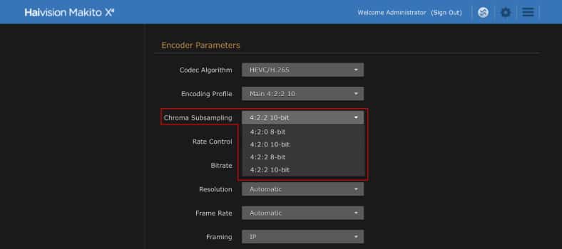 Next, you have a choice of settings for chroma subsampling and pixel depth. Choose from 4:2:0 8-bit to 4:2:2 10-bit, for workflows where color precision is needed, in order to maintain color fidelity and prevent artifacts in downstream workflows. For 4:2:10-bit, 4:2:2 8-bit and 4:2:2 10 bit, your encoding profile must be Main 10 or Main 4:2:2 10. In this example, we’ve chosen 4:2:2 10.