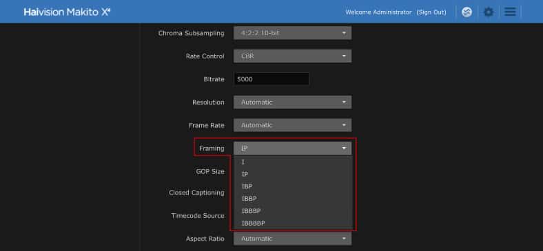 At this point you can select the coded picture frame rate per second (from 1 to 60) or choose automatic which encodes at the same frame rate as the input. For framing, select the video compression mode for the encoded video according to the desired delay and quality, choosing from the following 6 options: