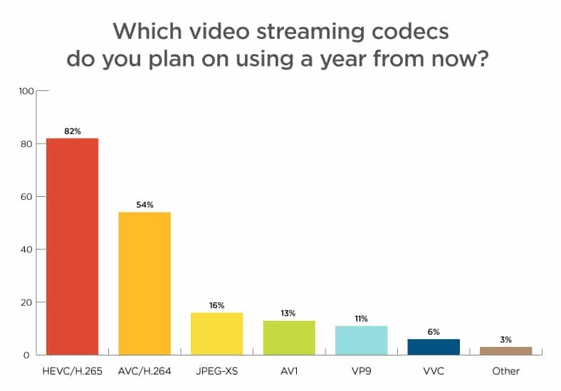 HEVC, or H.265, is a video compression codec that was developed to double the compression efficiency of the H.264/AVC codec while maintaining or even increasing picture quality. As video resolutions continues to evolve alongside HDR, the ability to stream and deliver higher quality content in 4K and even 8K over IP networks becomes an important challenge for broadcasters and video streaming professionals to overcome. While a three percent increase from last year might not seem like the biggest jump, 78 percent of those surveyed last year said they planned to use HEVC moving forward. Last year, more than three quarters of respondents said they were planning to adopt HEVC for contribution and delivery and the results from our 2021 report solidify that the industry is slowly, but surely moving away from H.264 and towards HEVC.