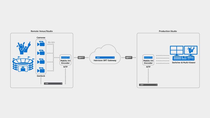 When producing live content using remote video, decoders receiving the live feeds need to be kept in sync so that a producer can immediately include any of the sources within their live broadcast workflow. There are several ways to mitigate multi-camera and audio sync issues over long distances including multiplexing camera feeds over a satellite uplink or using a dedicated private network. Streaming over the internet is more cost-effective and flexible, however it can be unpredictable as round-trip times and bandwidth availability can continually fluctuate.