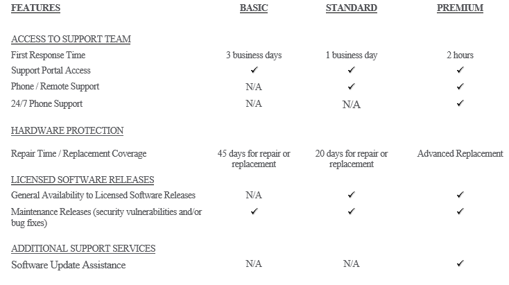 1.6 Haivision Support Response. In the event the Haivision support personnel are not immediately available, Haivision will respond to Customer’s request in the target timeframes in accordance with the level of Support Services purchased by Customer as detailed in the table at the end of these Supplemental Terms. Telephone support is only available for Customers who have purchased Premium or Standard Support.
