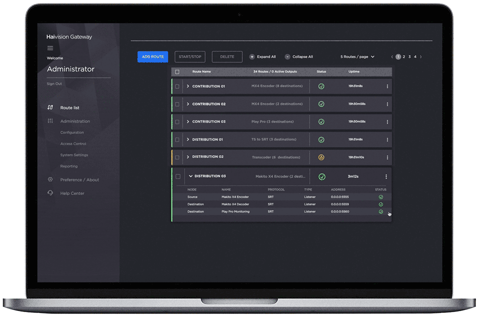 Haivision SRT Gateway performs live video routing and protocol conversion in real-time to optimize your streams to specific networks without affecting video quality and latency. Designed to facilitate live streaming over complex video workflows including remote contribution, backhaul, return feeds, bi-directional interviews, and content distribution for international syndication and sharing with affiliates, SRT Gateway is available as a dedicated appliance or for deployment in the cloud.
