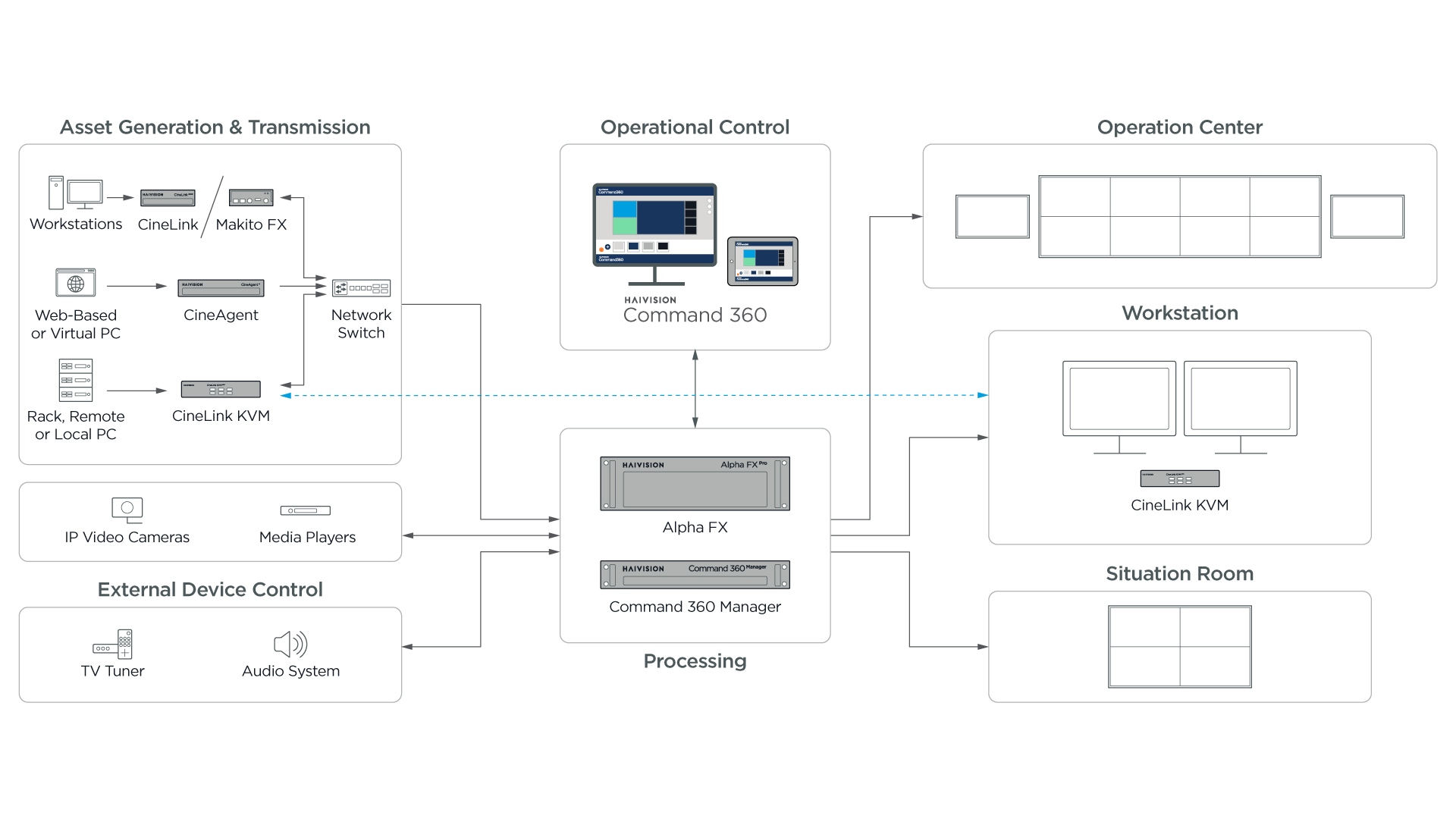 Haivision Command 360 is a complete video wall solution for situational awareness and real-time decision-making in mission-critical environments. Based on a full range of purpose-built hardware and software, Command 360 enables enterprises, defense agencies, and public safety teams to securely visualize and dynamically respond to urgent situations such as cybersecurity breaches, defense missions, and public emergencies faster than ever before.
