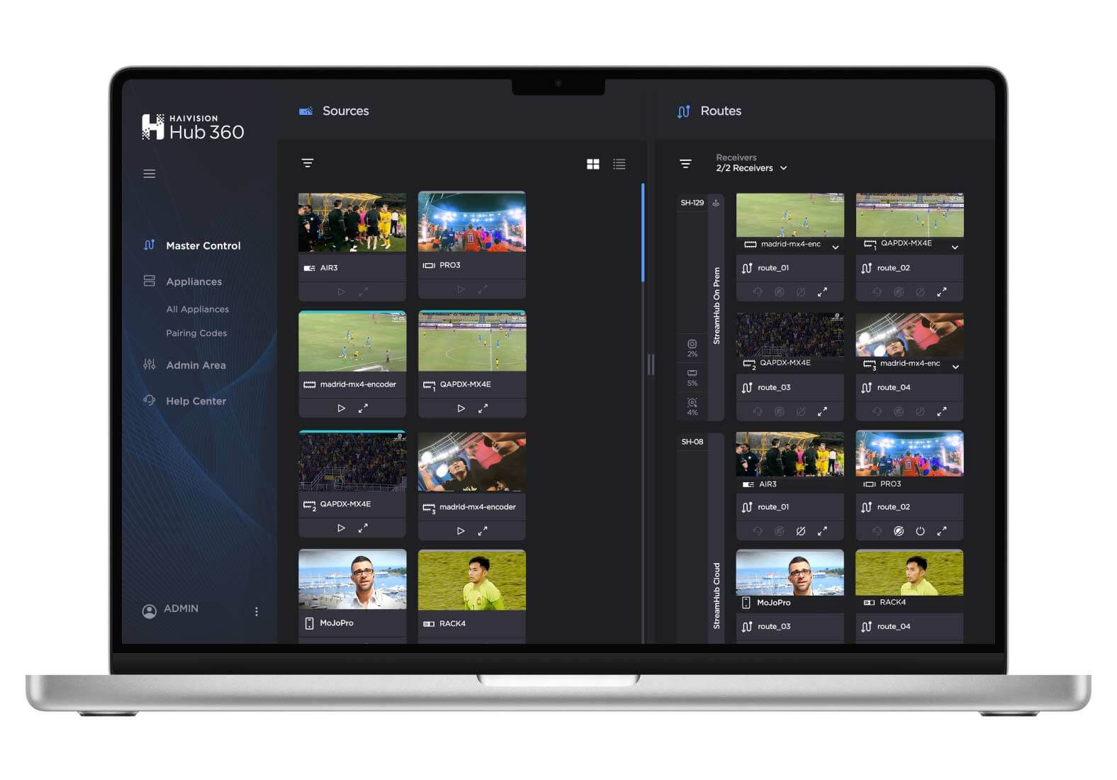 Haivision Hub 360 allows users to manage all outputs and destinations with preview thumbnail images, all within a master control grid view for the easy routing of live feeds to SDI, NDI, SMPTE ST 2110, SST, SRT, and other IP outputs. Hub 360 leverages two Emmy® award-winning technologies in SRT and SST to support live broadcast contribution over the internet and mobile networks, while managing both mobile transmitters and fixed encoders at the same time.